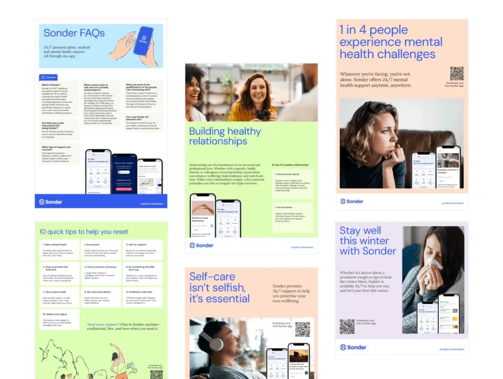 2) Alongside the direct emails from Sonder, your people will become aware of and engage with Sonder through the wide range of material you have available in your Sonder communications toolkit.The online toolkit contains assets relevant to all phases of your Sonder partnership. From launch marketing material, through to ongoing engagement, product education pieces and timely monthly themed materials. And everything can be easily co-branded should you wish to do so.