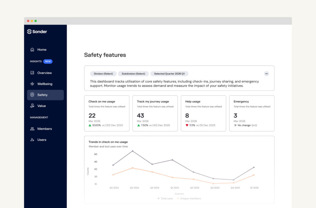 Safety insight is most valuable when it reflects how support is being used by your people in practice. The Safety view shows how people are engaging with Sonder’s proactive safety features. This data provides valuable insight into your people’s awareness, adoption and usage of these tools over time.