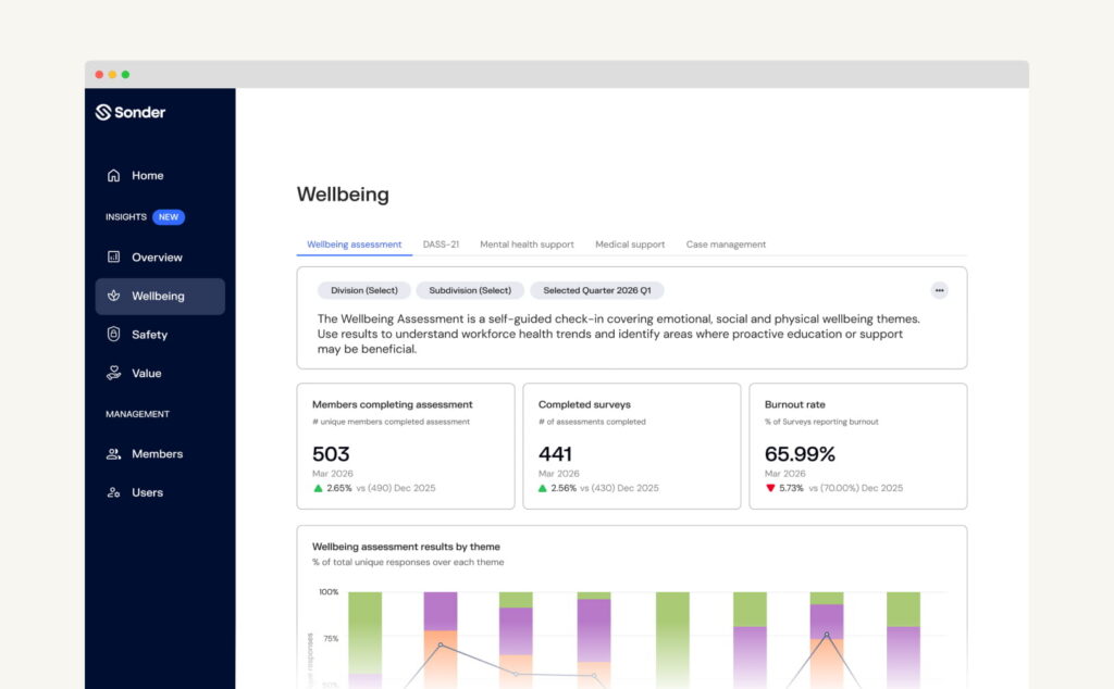 - Track wellbeing and safety trends: Deep dives into DASS-21 indicators, mental health priorities, and the adoption of Sonder’s safety tools creates a clear picture of how people are tracking.