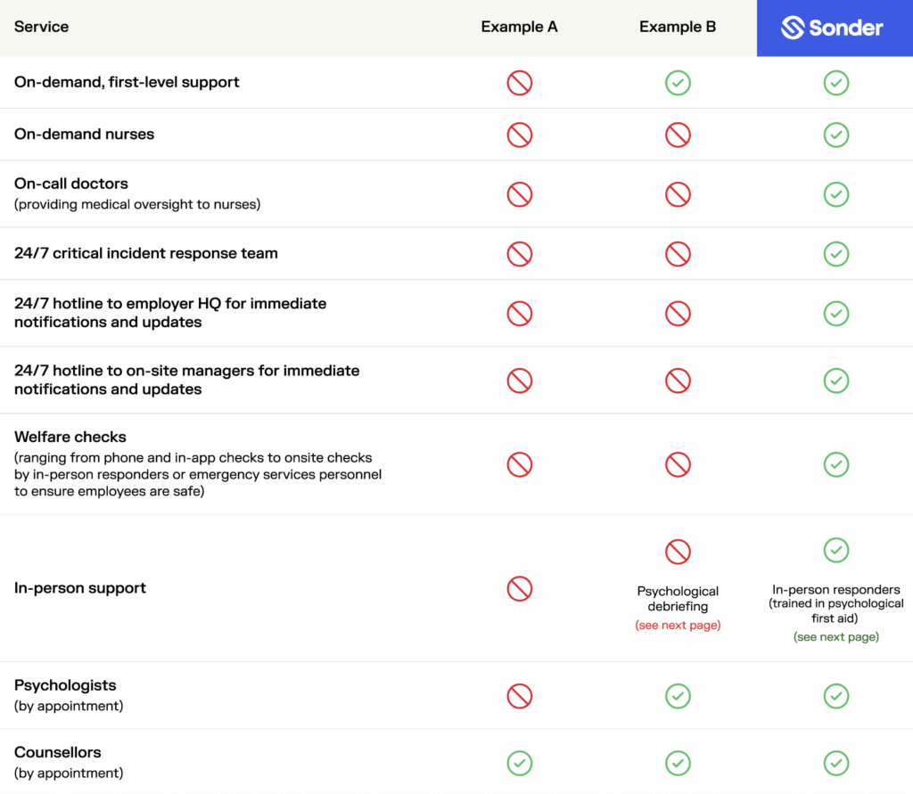 | Services offered | Example A | Example B | Example C | Example D | Sonder |