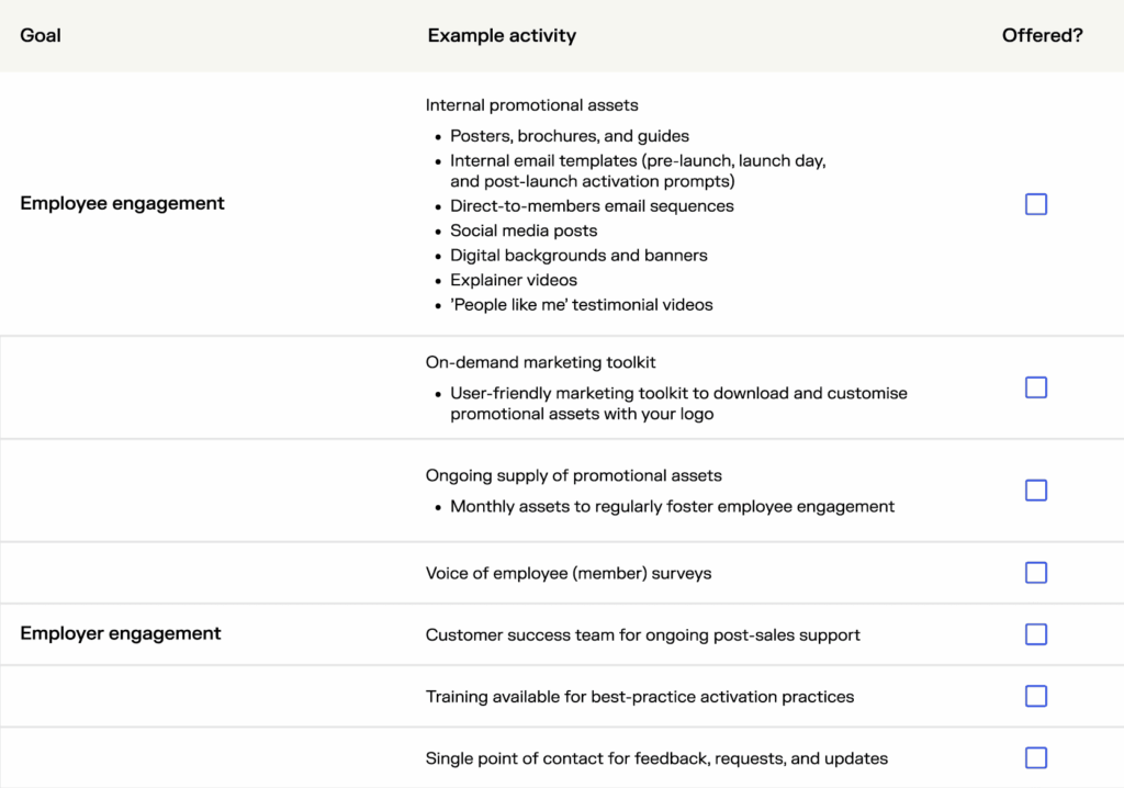Check if your provider can help with initial and ongoing ‘voice of employee’ (member) surveys, to establish employee wellbeing benchmark data at various points in time.
