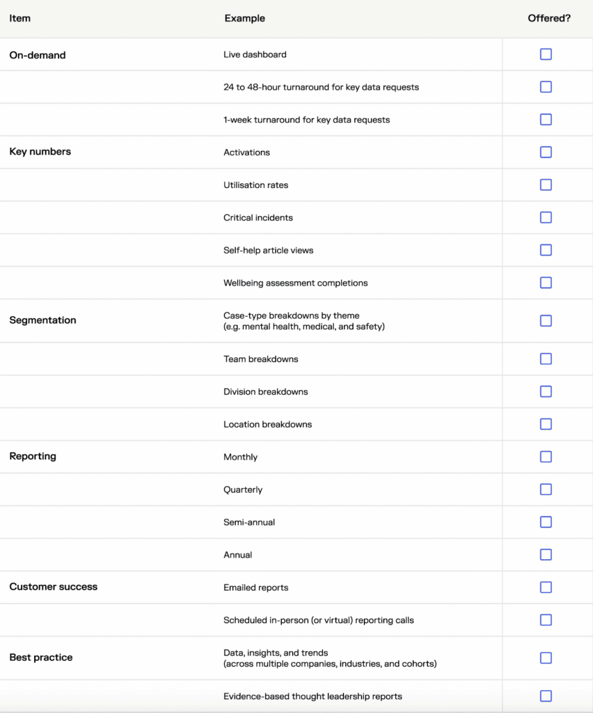 Ask providers how they define “utilisation rate.” Is it mobile app downloads, digital interactions, integrations (which can give a misleading “100%” rate), human interactions, counselling sessions, or something else?
