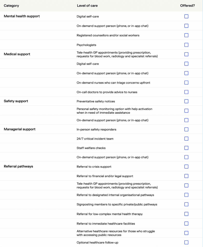 These heightened expectations align with a rise in employee expectations. Now more than ever, employees want their employers to step up and share the responsibility for their wellbeing. For many, their health and safety depend on it. If they cannot talk to a doctor in a medical emergency, speak with a psychologist or clinician when they are feeling suicidal, or access family and domestic violence leave when their situation at home has become untenable, their lives can be at risk.