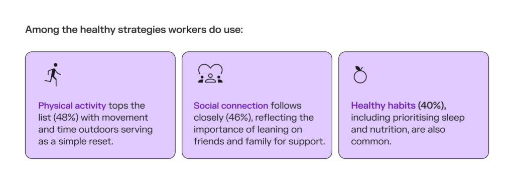 Many employees are doing their best to cope through exercise or social connection. These strategies can help, but the data reveals a clear gap between what people are carrying and the support they access.