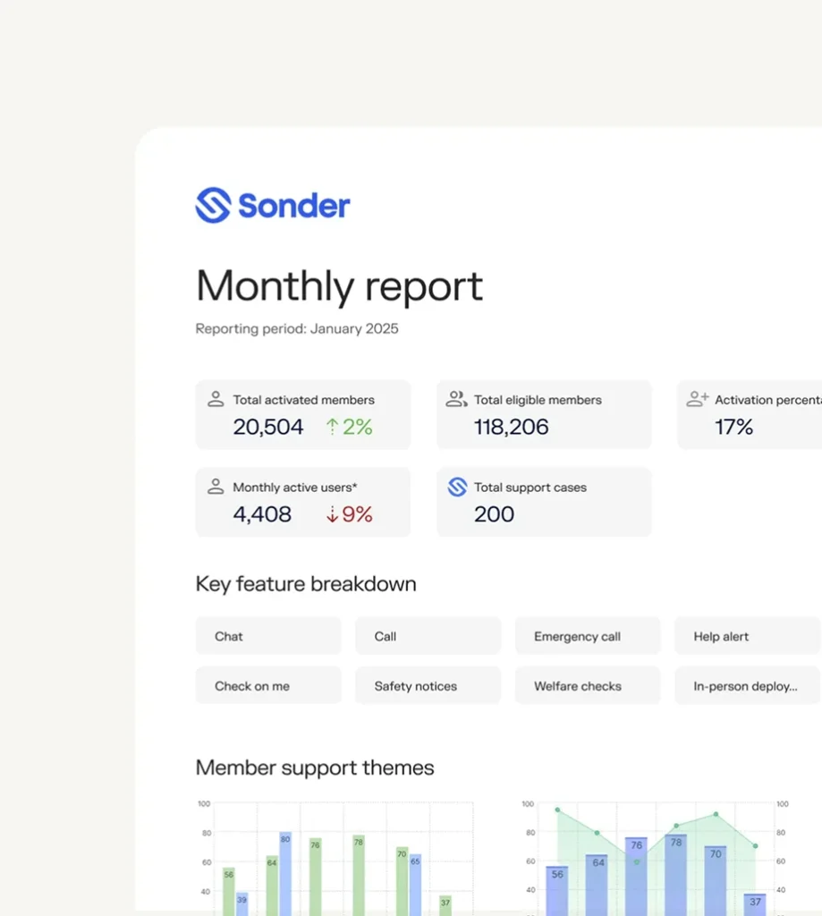 Insightful Risk Mitigation: Sonder delivers valuable insights for risk mitigation through anonymised and aggregated reporting. This service seamlessly integrates into your existing well-being ecosystem, often serving as a central point of access for employees.